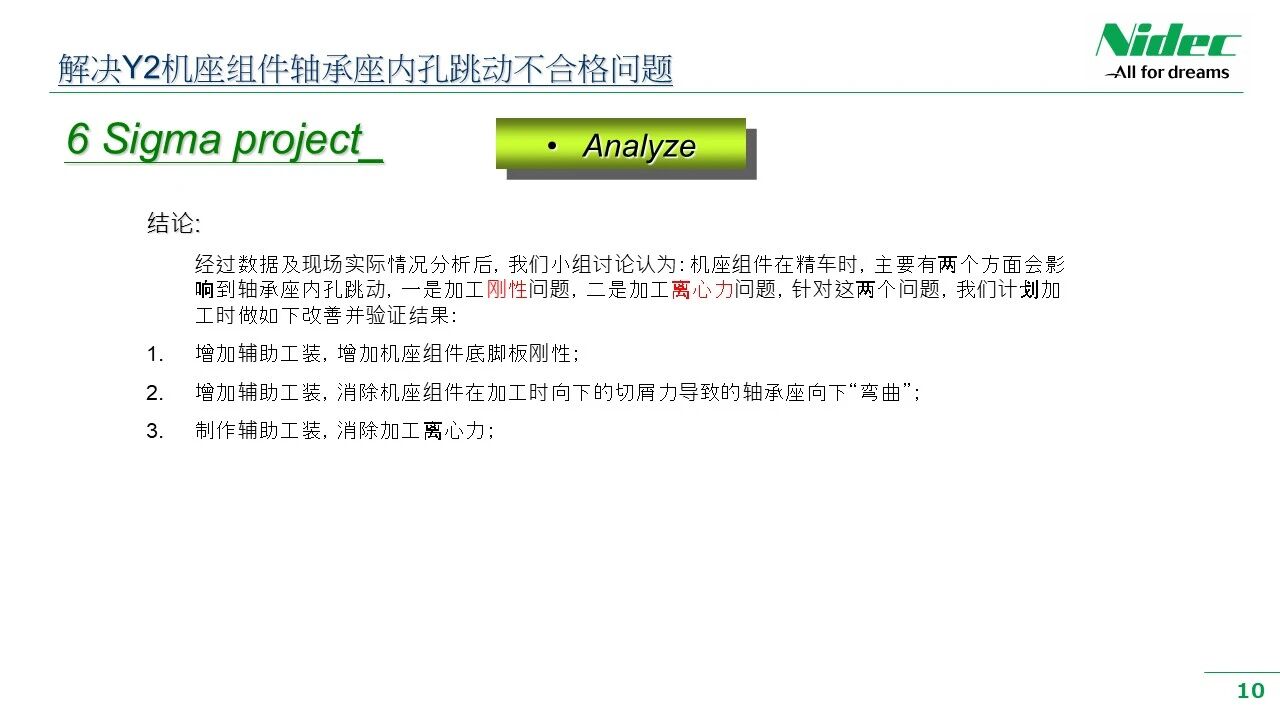 Proces zlepšovania DMAIC zahŕňa päť fáz: definovať, merať, analyzovať, zlepšovať a kontrolovať. Týchto päť fáz predstavuje metódu zvyšovania kvality celého procesu a každá fáza pozostáva z niekoľkých pracovných krokov. Nasleduje stručný popis zlepšenia problému, že koaxiálnosť prednej a zadnej ložiskovej komory a hádzanie čelnej plochy montáže sú po montáži zdvojenej podpery stroja a montáže ložiskovej komory nestabilné: