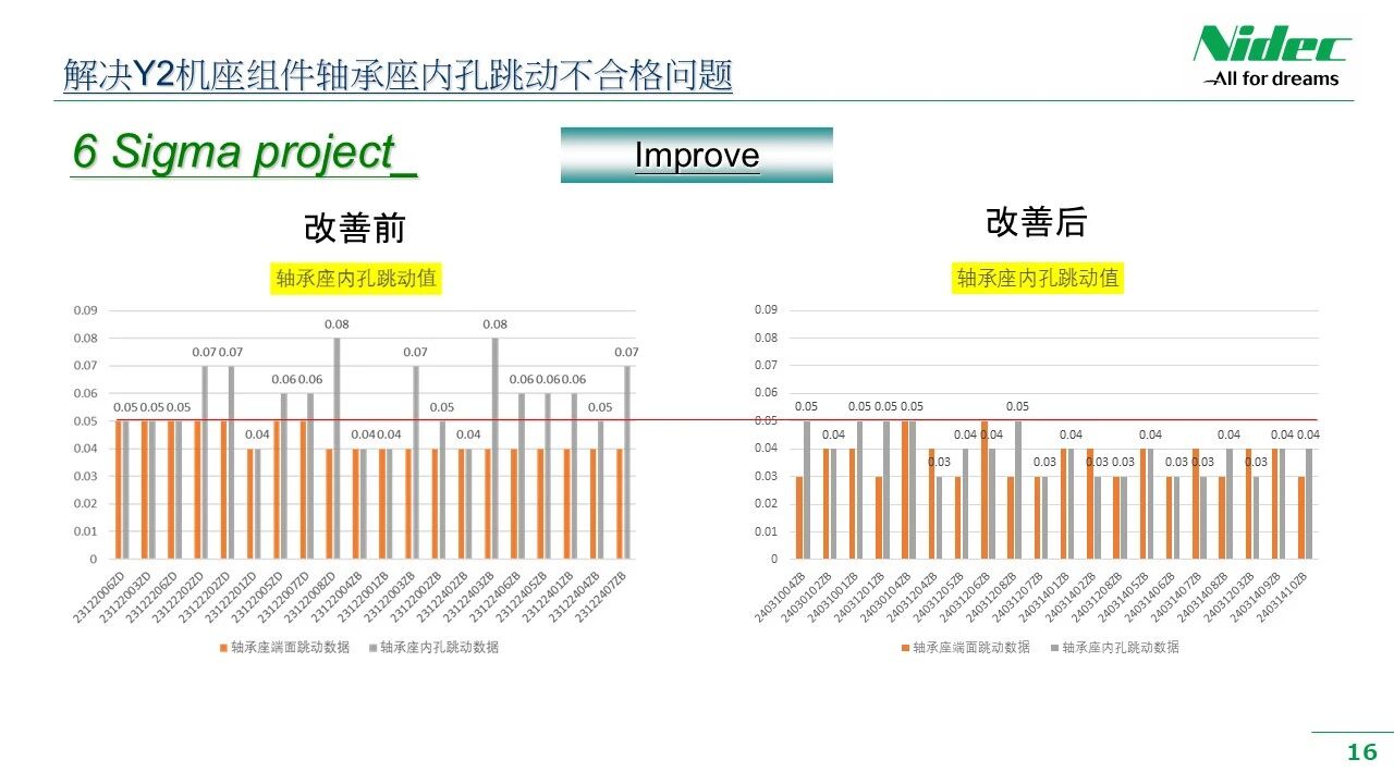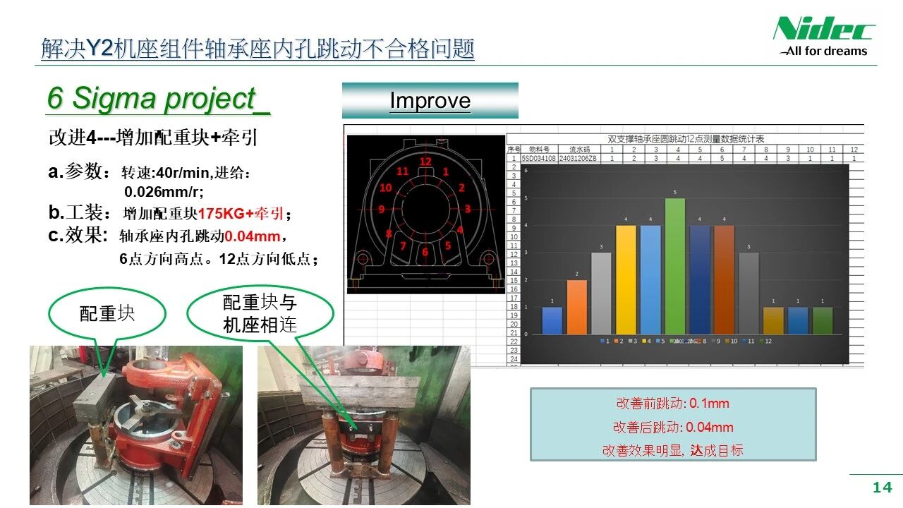 • b) Cieľ zlepšenia: Miera defektov je menšia ako 200 PPM a hádzanie ložiskovej komory je menšie ako 0,05 mm.
