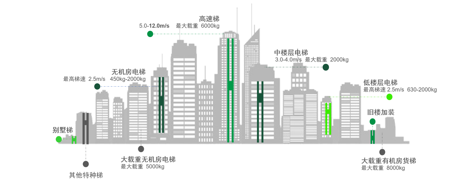Ponúkame širokú škálu trakčných strojov a zodpovedajúcich mainframov, vhodných pre aplikačné scenáre s maximálnou nosnosťou 6000 kg (pomer 2:1) a maximálnou rýchlosťou 12 m/s (pomer 1:1). Zákazníci si môžu priamo vybrať vhodné modely na základe parametrov výťahu, čím sa výrazne skráti konštrukčný cyklus.